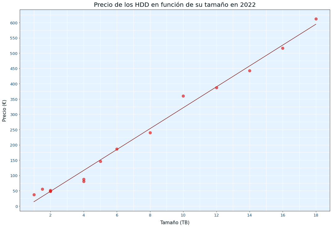 axes.set_title("Precio de los HDD en función de su tamaño en 2022", fontsize=20,pad=10,color="#011119")