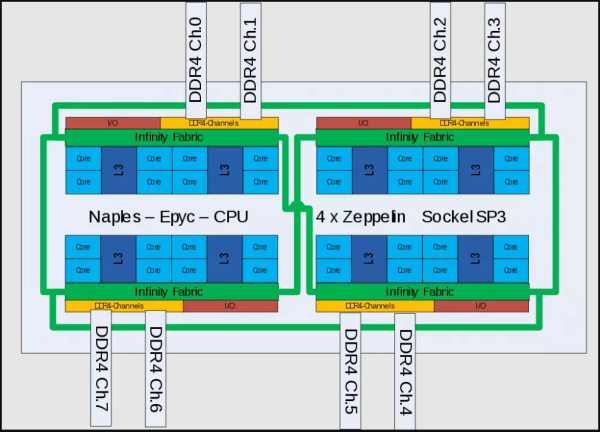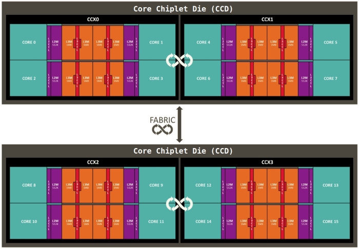 En Zen, los nucleos y la cache L3 se organiza de una forma jerarquica.