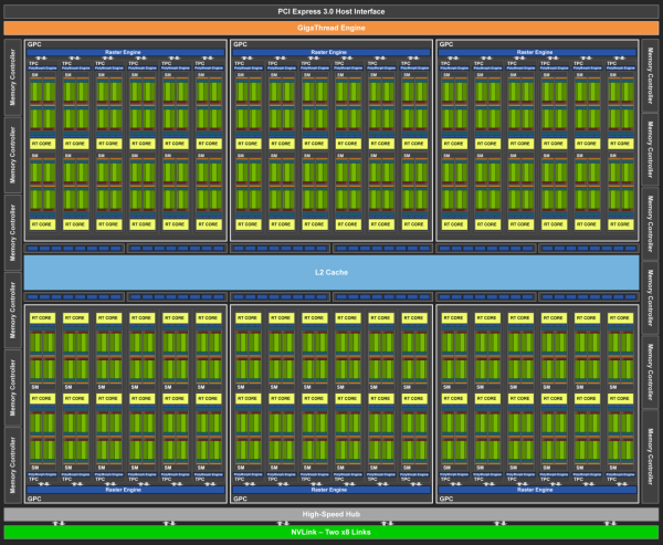 La siguiente arquitectura es de una Tarjeta gŕafica "NVIDIA Quadro RTX 6000" con arquitectura Turing y GPU TU102
