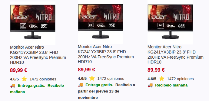 <c-articulo nombre="Monitor Acer Nitro KG241YX3BIP 23.8' FHD 200Hz VA FreeSync Premium HDR10" urlImagen="https://logongas.es/lib/exe/fetch.php?cache=&media=clase:daw:diw:1eval:monitor.webp" [precioActual]="89.99" [precioAnterior]="99.99" [valoracion]="4.6" [numeroOpiniones]="1472" [fechaEntrega]="fechaEntrega" [precioEnvio]="0.00" [otrosEnvios]="true" />