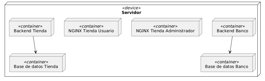 tienda-back: El API de la tienda en Javatienda-front: El interfaz de usuario en Angular de los clientes de la tiendatienda-adm-front: El interfaz de usuario en Angular del administrador de la tiendabanco-back: El API del banco en Javadesplegar-proyecto: El repositorio con los Scripts para desplegar. Es donde se usa Docker o la tecnología que se vaya a usar.