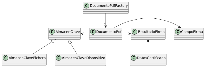 DocumentoPdfFactory --> "*" DocumentoPdf AlmacenClave <- DocumentoPdf DocumentoPdf -> CampoFirma DocumentoPdf -> ResultadoFirma AlmacenClave <|-- AlmacenClaveFichero AlmacenClave <|-- AlmacenClaveDispositivo ResultadoFirma *-- DatosCertificado