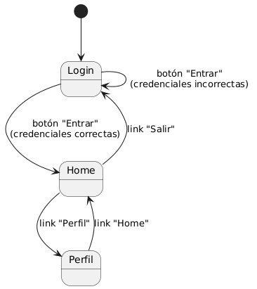 [*] --> Login Login --> Home : botón "Entrar"\n(credenciales correctas) Login --> Login : botón "Entrar"\n(credenciales incorrectas) Home --> Perfil : link "Perfil" Home --> Login : link "Salir" Perfil --> Home : link "Home"
