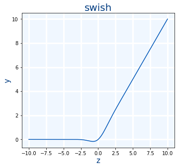 $$swish(x)=x \cdot sigmoid(x)=x \cdot \frac{1}{1+e^{-x}}=\frac{x}{1+e^{-x}}$$
