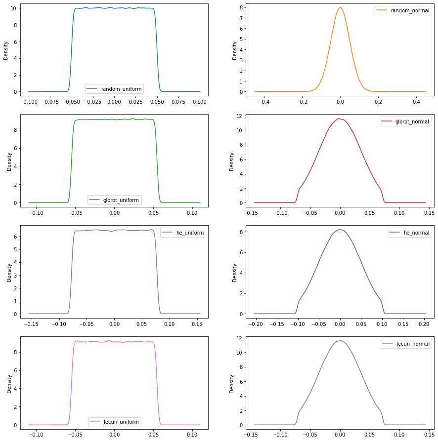 initializers=["random_uniform","random_normal","glorot_uniform","glorot_normal","he_uniform","he_normal","lecun_uniform","lecun_normal","zeros","ones"]
