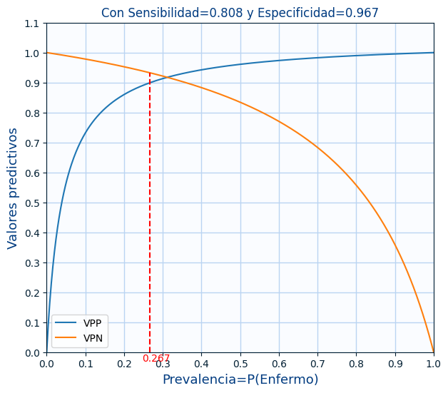 Muestra ahora una gráfica con matplolib en la que se vea como evolucionan los valores de VPP y VPN según la prevalencia.