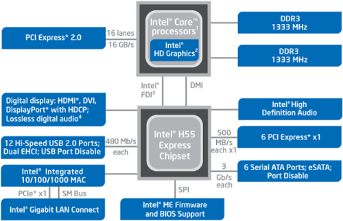 En el siguiente diagrama podemos ver un ejemplo del chipset H55 de Intel: