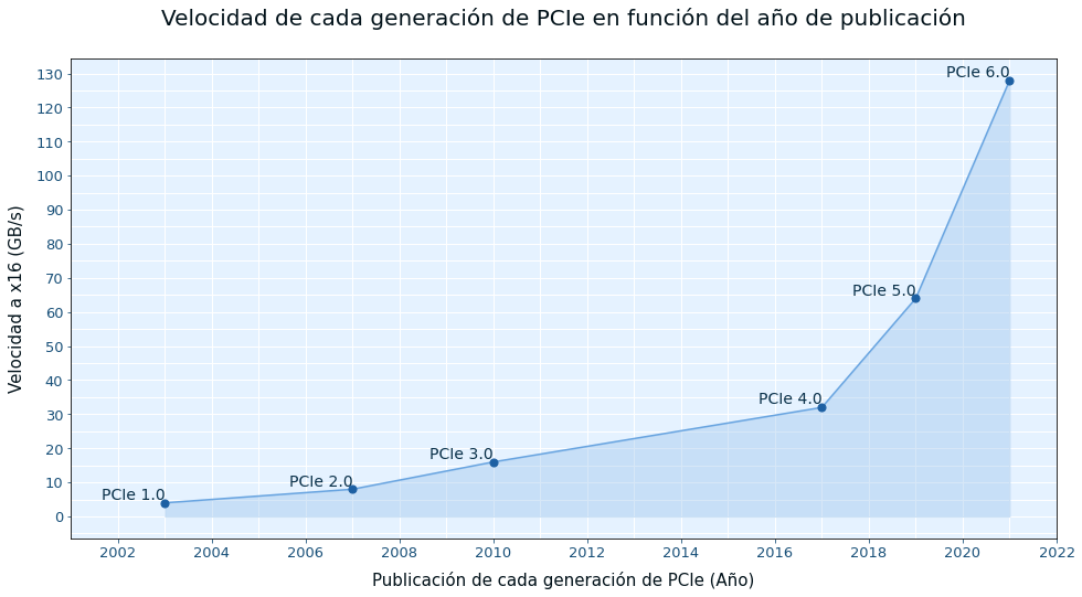 axes.set_xlabel('Publicación de cada generación de PCIe (Año)', fontsize=15,labelpad=10,color="#011119")