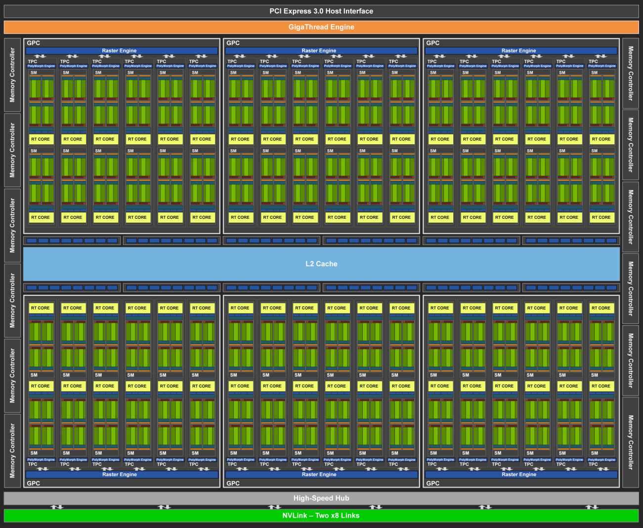 La siguiente arquitectura es de una Tarjeta gŕafica "NVIDIA Quadro RTX 6000" con arquitectura Turing y GPU TU102