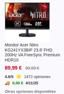 <c-articulo nombre="Monitor Acer Nitro KG241YX3BIP 23.8' FHD 200Hz VA FreeSync Premium HDR10" urlImagen="https://logongas.es/lib/exe/fetch.php?cache=&media=clase:daw:diw:1eval:monitor.webp" [precioActual]="89.99" [precioAnterior]="99.99" [valoracion]="4.6" [numeroOpiniones]="1472" [fechaEntrega]="fechaEntrega" [precioEnvio]="0.00" [otrosEnvios]="true" />