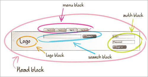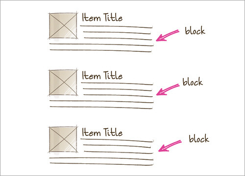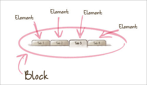 Como los bloques pueden ser muy complejos, cada bloque puede tener si lo necesita de "elementos". Veamos un ejemplo: