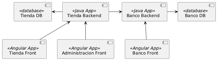 tienda-back: El API de la tienda en Javatienda-front: El interfaz de usuario en Angular de los clientes de la tiendatienda-adm-front: El interfaz de usuario en Angular del administrador de la tiendabanco-back: El API del banco en Javabanco-front: El interfaz de usuario en Angular de los clientes del bancodesplegar-proyecto: El repositorio con los Scripts para desplegar. Es donde se usa Docker o la tecnología que se vaya a usar.
