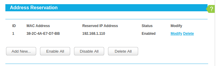 Por último tenemos la cuadratura del círculo, que es poder tener una IP fija con DHCP. ¿Como se hace? Pues es muy sencillo , reservamos la IP diciendo que esa IP solo se la demos a cierta MAC. En la siguiente imagen de un router , podemos ver como la IP 192.168.1.110 siempre se dará a la MAC 38-2C-4A-E7-D7-BB.