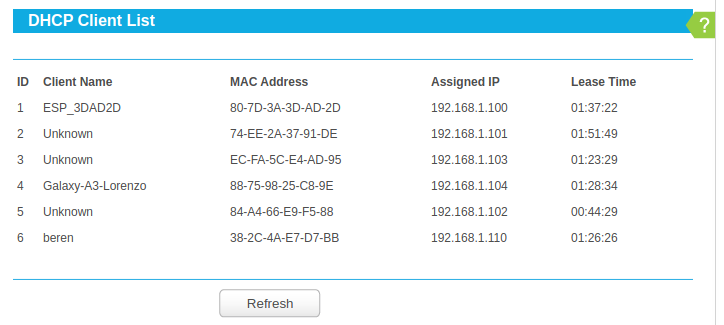 En la siguiente imagen de un router se ve la tabla que tiene el servidor de DHCP con las MAC y las IPs que ha dado a cada MAC, de esa forma puede intentar dar la misma IP a la misma MAC la próxima vez que el ordenador arranque y pida una IP.