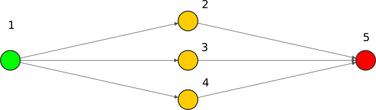 $$\hat{y}=\frac{1}{1 + e^{-( w_{5,2}\frac{1}{1 + e^{-( w_{2}x+b_{2} )}}+w_{5,3}\frac{1}{1 + e^{-( w_{3}x+b_{3} )}}+w_{5,4}\frac{1}{1 + e^{-( w_{4}x+b_{4} )}}+b_5 )}}$$