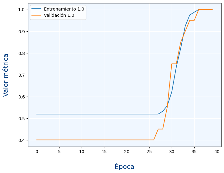 Podemos ver en el gráfico que la métrica es muy similar con los datos de validación que con los de entrenamiento. otro detalle importante es que las métricas suelen ser buenas si su valor es 1 (al contrario de las funciones de pérdida en la que lo bueno era un 0)